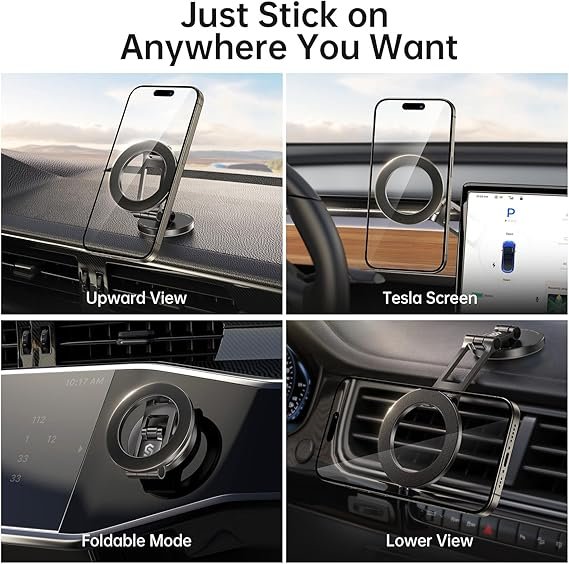 The MagSafe-compatible magnetic system ensures quick snap-on attachment and one-hand operation, making mounting and removal smooth and hassle-free. Its versatile design is suitable for car dashboards and Tesla screens, blending seamlessly with modern vehicle interiors.